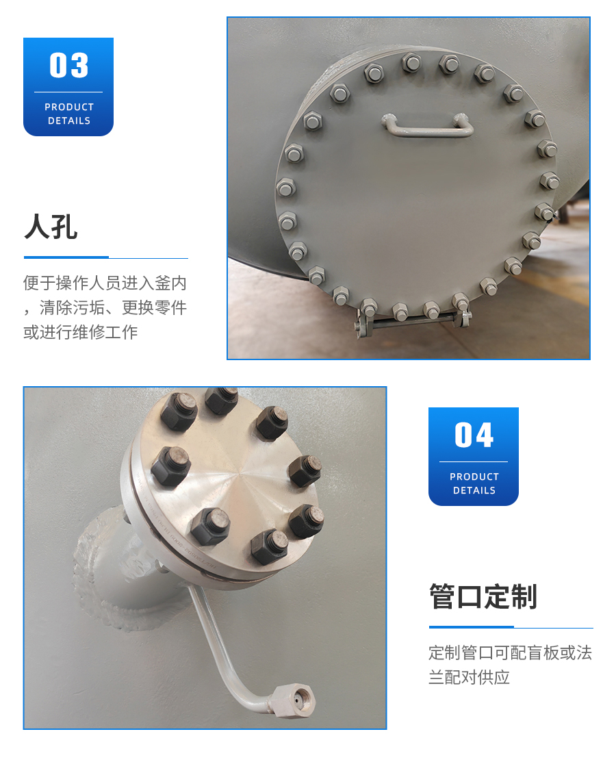 氣相口、液相口、測溫口、固體加料口、壓力表爆破片(安全閥)口、人孔(手孔)備用口、釜內(nèi)冷卻盤管口(可根據(jù)壓力增加視鏡口及其它管口)。 |