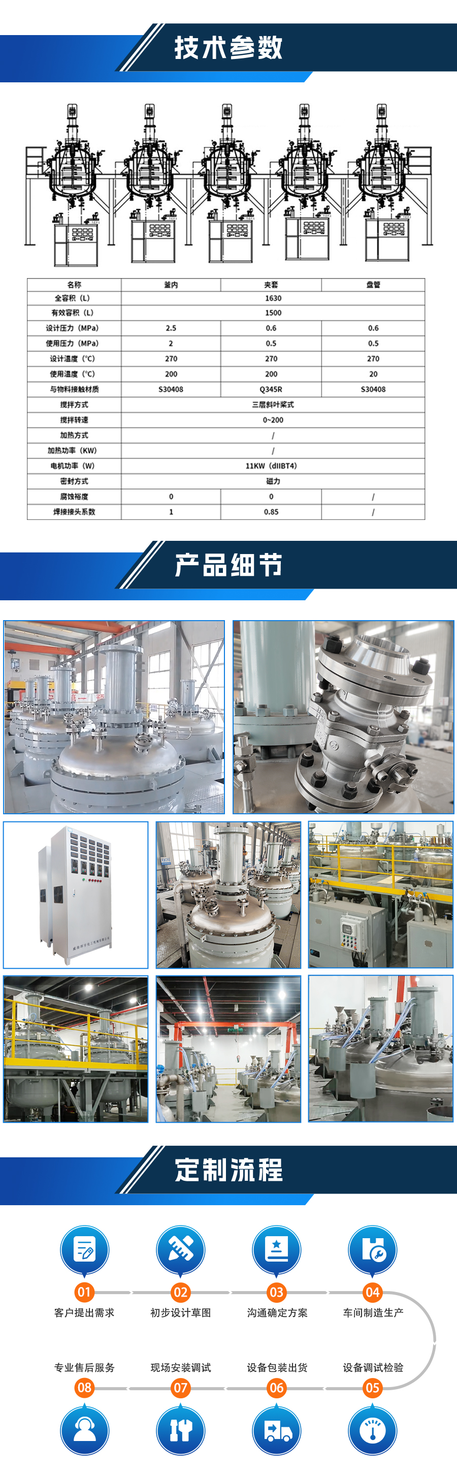 如果用戶在釜蓋、釜體開口、內(nèi)部結(jié)構(gòu)、壓力高低、攪拌槳葉、及增加其他輔助裝置(如冷凝回流裝置、冷凝器、恒壓加料罐、接收裝置)等有特殊要求,可完全按用戶的要求加工制造。 |
